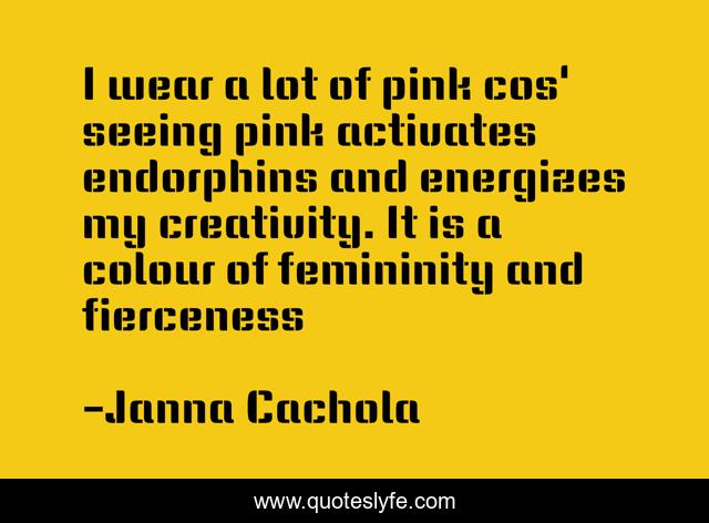 This page presents the quote "I wear a lot of pink cos' seeing pink activates endorphins and energizes my creativity. It is a colour of femininity and fierceness". Author of this quote is Janna Cachola. This quote is about pink, inspire, energize, girl-power, girlboss, colour, motivate, creativity, boss-lady,.