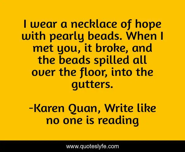 This page presents the quote "I wear a necklace of hope with pearly beads. When I met you, it broke, and the beads spilled all over the floor, into the gutters.". Author of this quote is Karen Quan, Write like no one is reading. This quote is about heartache, relationships, beads, gutter, floor, breakup, heartbreak, broken, sadness,.