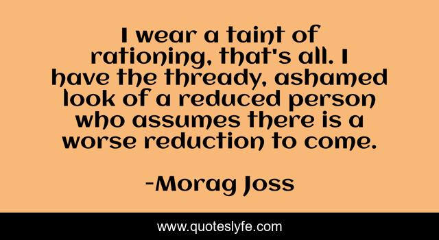 This page presents the quote "I wear a taint of rationing, that's all. I have the thready, ashamed look of a reduced person who assumes there is a worse reduction to come.". Author of this quote is Morag Joss. This quote is about shame, enlightenment, relaziation,.