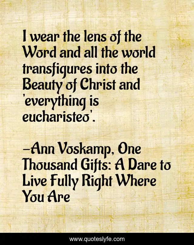 This page presents the quote "I wear the lens of the Word and all the world transfigures into the Beauty of Christ and 'everything is eucharisteo'.". Author of this quote is Ann Voskamp, One Thousand Gifts: A Dare to Live Fully Right Where You Are. This quote is about bible, eucharist,.