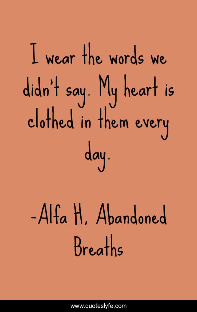 This page presents the quote "I wear the words we didn't say. My heart is clothed in them every day.". Author of this quote is Alfa H, Abandoned Breaths. This quote is about relationships, heart, life, love, poetry, words, affection,.
