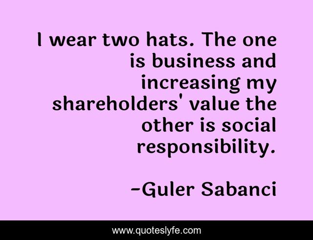 This page presents the quote "I wear two hats. The one is business and increasing my shareholders' value the other is social responsibility.". Author of this quote is Guler Sabanci. This quote is about hats, responsibility, value,.