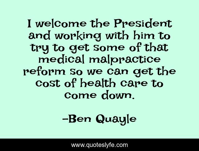This page presents the quote "I welcome the President and working with him to try to get some of that medical malpractice reform so we can get the cost of health care to come down.". Author of this quote is Ben Quayle. This quote is about welcome, health, care,.