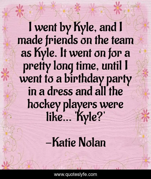 This page presents the quote "I went by Kyle, and I made friends on the team as Kyle. It went on for a pretty long time, until I went to a birthday party in a dress and all the hockey players were like... 'Kyle?'". Author of this quote is Katie Nolan. This quote is about time, friends, team,.