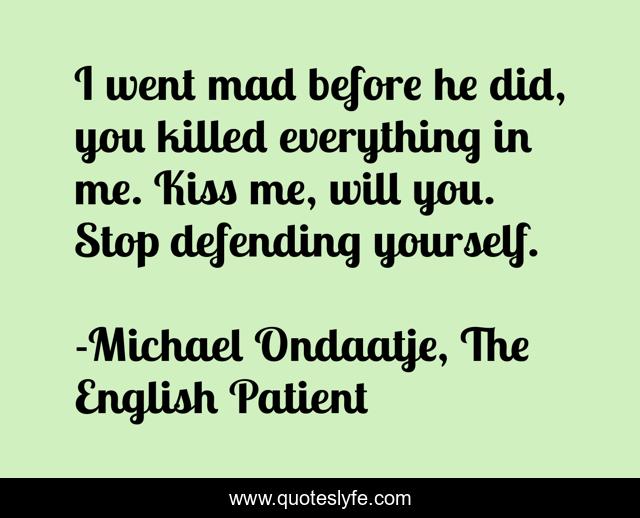 This page presents the quote "I went mad before he did, you killed everything in me. Kiss me, will you. Stop defending yourself.". Author of this quote is Michael Ondaatje, The English Patient. This quote is about the-english-patient, novel, love, almasy, romance, michael-ondaatje, katharine, affection,.