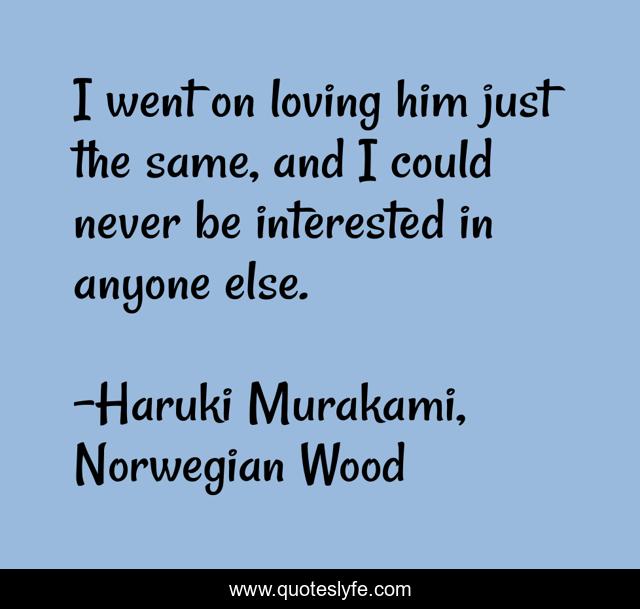 This page presents the quote "I went on loving him just the same, and I could never be interested in anyone else.". Author of this quote is Haruki Murakami, Norwegian Wood. This quote is about books, book, norwegian-wood,.