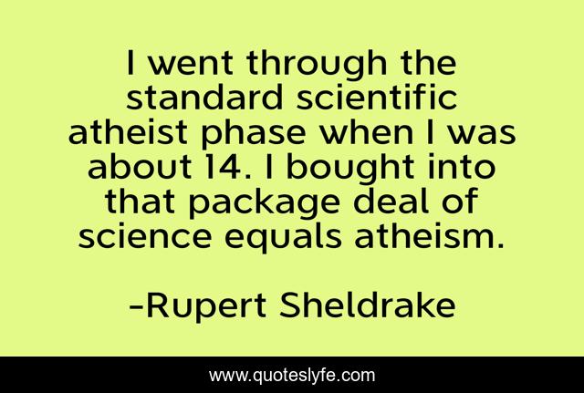 This page presents the quote "I went through the standard scientific atheist phase when I was about 14. I bought into that package deal of science equals atheism.". Author of this quote is Rupert Sheldrake. This quote is about atheism, atheist, through,.