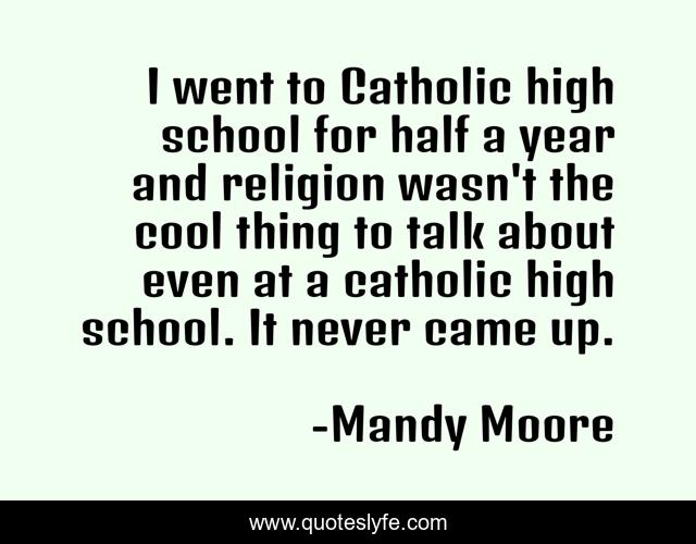 This page presents the quote "I went to Catholic high school for half a year and religion wasn't the cool thing to talk about even at a catholic high school. It never came up.". Author of this quote is Mandy Moore. This quote is about religion, school,.