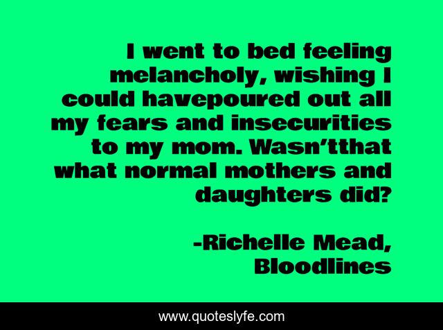 This page presents the quote "I went to bed feeling melancholy, wishing I could havepoured out all my fears and insecurities to my mom. Wasn’tthat what normal mothers and daughters did?". Author of this quote is Richelle Mead, Bloodlines. This quote is about bloodlines, sydney-sage, mother,.