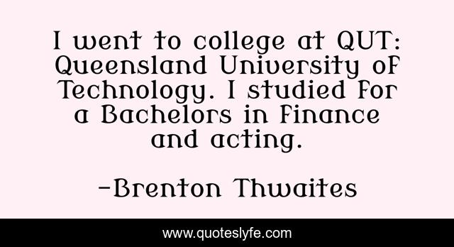 This page presents the quote "I went to college at QUT: Queensland University of Technology. I studied for a Bachelors in finance and acting.". Author of this quote is Brenton Thwaites. This quote is about technology, acting, college,.