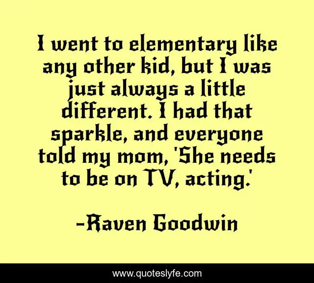 This page presents the quote "I went to elementary like any other kid, but I was just always a little different. I had that sparkle, and everyone told my mom, 'She needs to be on TV, acting.'". Author of this quote is Raven Goodwin. This quote is about acting, little, she,.