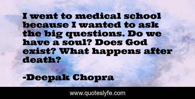 This page presents the quote "I went to medical school because I wanted to ask the big questions. Do we have a soul? Does God exist? What happens after death?". Author of this quote is Deepak Chopra. This quote is about god, school, medical,.