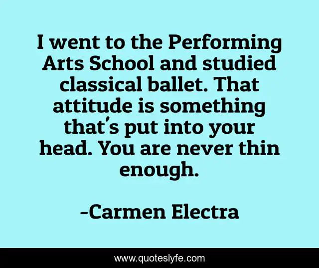 This page presents the quote "I went to the Performing Arts School and studied classical ballet. That attitude is something that's put into your head. You are never thin enough.". Author of this quote is Carmen Electra. This quote is about school, ballet,.