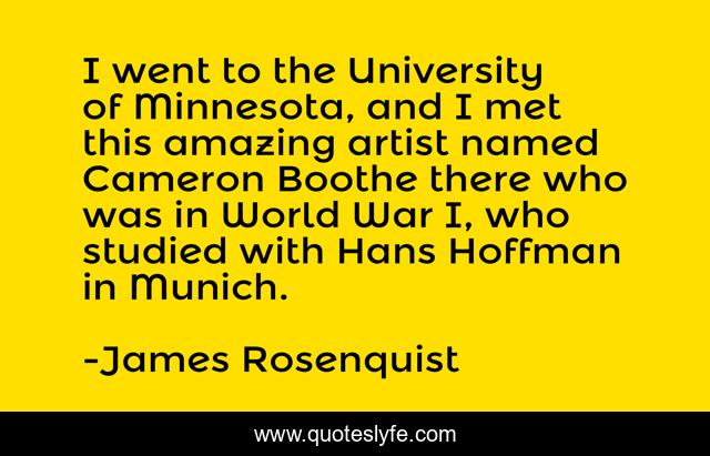 This page presents the quote "I went to the University of Minnesota, and I met this amazing artist named Cameron Boothe there who was in World War I, who studied with Hans Hoffman in Munich.". Author of this quote is James Rosenquist. This quote is about world, war, artist,.