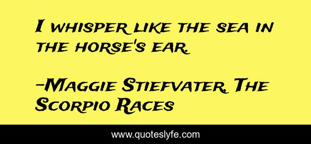 This page presents the quote "I whisper like the sea in the horse's ear.". Author of this quote is Maggie Stiefvater, The Scorpio Races. This quote is about horse, race, corr, sea, sean,.