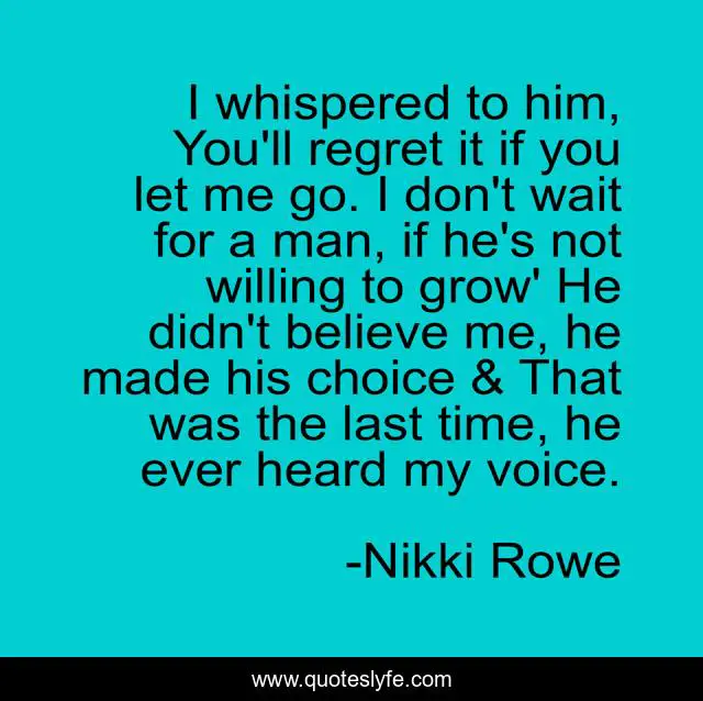 This page presents the quote "I whispered to him, You'll regret it if you let me go. I don't wait for a man, if he's not willing to grow' He didn't believe me, he made his choice & That was the last time, he ever heard my voice.". Author of this quote is Nikki Rowe. This quote is about wise-words, love, quote-of-the-day, worthiness, letting-go, freedom, let-go, move-on, self-worth,.