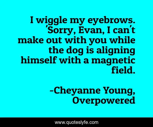 This page presents the quote "I wiggle my eyebrows. 'Sorry, Evan, I can't make out with you while the dog is aligning himself with a magnetic field.". Author of this quote is Cheyanne Young, Overpowered. This quote is about hero, overpowered, powered, ya, maci-might, maci, superhero, heroes, superheroes,.