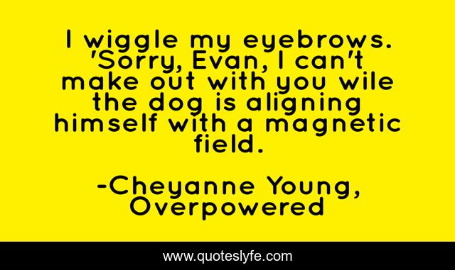 This page presents the quote "I wiggle my eyebrows. 'Sorry, Evan, I can't make out with you wile the dog is aligning himself with a magnetic field.". Author of this quote is Cheyanne Young, Overpowered. This quote is about hero, overpowered, powered, ya, maci-might, maci, heroes, superheroes,.