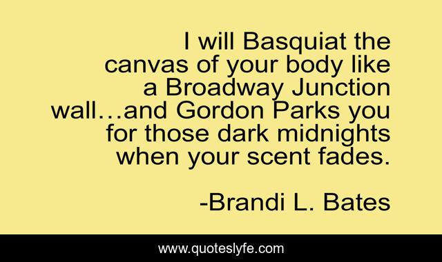 This page presents the quote "I will Basquiat the canvas of your body like a Broadway Junction wall…and Gordon Parks you for those dark midnights when your scent fades.". Author of this quote is Brandi L. Bates. This quote is about urban, love, brandi-bates, gordon-parks, poetry, new-york, basquiat, affection,.
