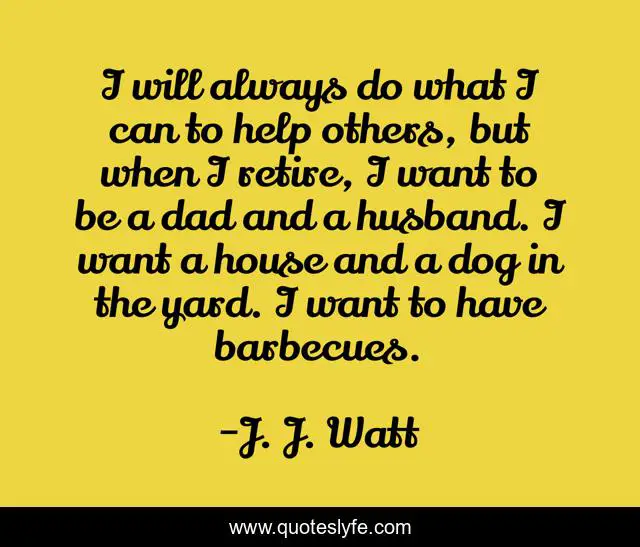This page presents the quote "I will always do what I can to help others, but when I retire, I want to be a dad and a husband. I want a house and a dog in the yard. I want to have barbecues.". Author of this quote is J. J. Watt. This quote is about help others, dog, help,.