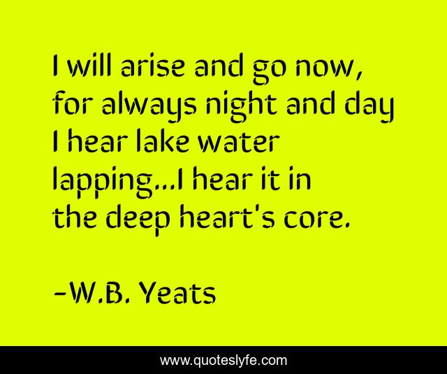 This page presents the quote "I will arise and go now, for always night and day I hear lake water lapping...I hear it in the deep heart's core.". Author of this quote is W.B. Yeats. This quote is about yeats, poetry, inspirational, enthusiasm,.