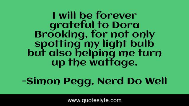 This page presents the quote "I will be forever grateful to Dora Brooking, for not only spotting my light bulb but also helping me turn up the wattage.". Author of this quote is Simon Pegg, Nerd Do Well. This quote is about light-bulb, inspirational, enthusiasm, wattage, thoughts, dora-brooking,.