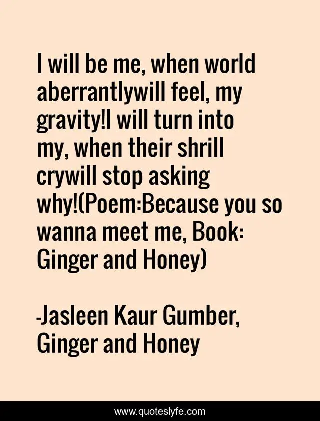 This page presents the quote "I will be me, when world aberrantlywill feel, my gravity!I will turn into my, when their shrill crywill stop asking why!(Poem:Because you so wanna meet me, Book: Ginger and Honey)". Author of this quote is Jasleen Kaur Gumber, Ginger and Honey. This quote is about identity, society, questions, truth,.