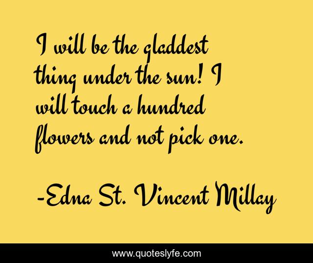 This page presents the quote "I will be the gladdest thing under the sun! I will touch a hundred flowers and not pick one.". Author of this quote is Edna St. Vincent Millay. This quote is about sun, flowers,.