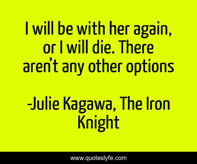 This page presents the quote "I will be with her again, or I will die. There aren’t any other options". Author of this quote is Julie Kagawa, The Iron Knight. This quote is about meghan-chase, love, the-iron-fey, ash, obsession, affection,.
