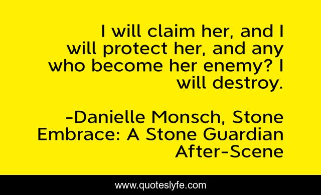 This page presents the quote "I will claim her, and I will protect her, and any who become her enemy? I will destroy.". Author of this quote is Danielle Monsch, Stone Embrace: A Stone Guardian After-Scene. This quote is about gargoyle, romance, paranormal,.