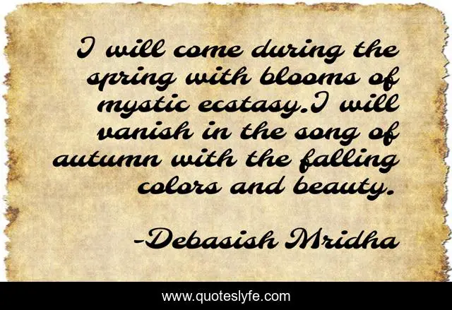 This page presents the quote "I will come during the spring with blooms of mystic ecstasy.I will vanish in the song of autumn with the falling colors and beauty.". Author of this quote is Debasish Mridha. This quote is about life, love, knowledge, inspirational, intelligence, philosophy, wisdom, quotes, affection,.
