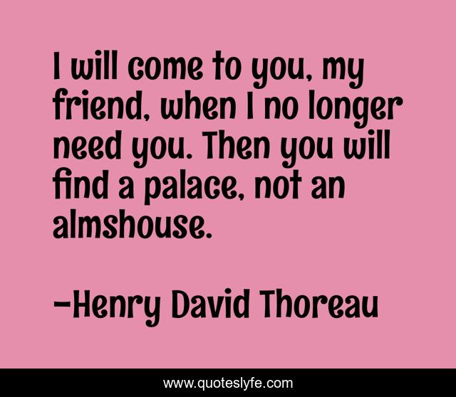This page presents the quote "I will come to you, my friend, when I no longer need you. Then you will find a palace, not an almshouse.". Author of this quote is Henry David Thoreau. This quote is about voice, identity, self-knowledge,.