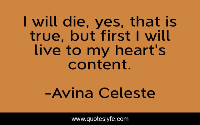 This page presents the quote "I will die, yes, that is true, but first I will live to my heart's content.". Author of this quote is Avina Celeste. This quote is about life, death, positive, motivational, confidence, contentment, optimistic, inspirational, enthusiasm,.