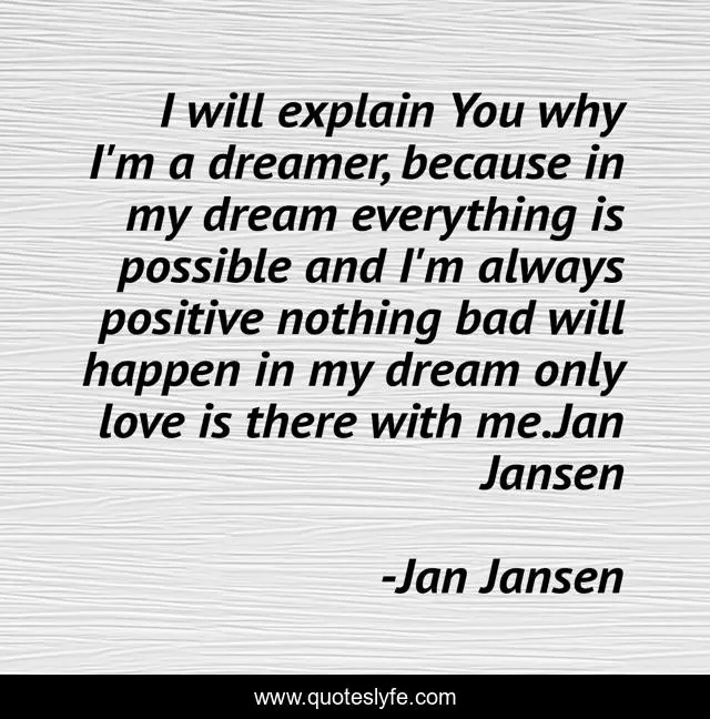 This page presents the quote "I will explain You why I'm a dreamer, because in my dream everything is possible and I'm always positive nothing bad will happen in my dream only love is there with me.Jan Jansen". Author of this quote is Jan Jansen. .