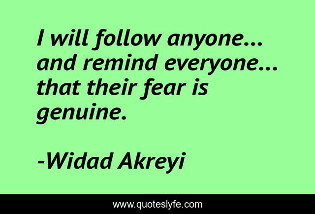 This page presents the quote "I will follow anyone... and remind everyone... that their fear is genuine.". Author of this quote is Widad Akreyi. This quote is about widad-akrawi, human-rights, peace, yazidis, civil-society, defend-international, inspirational, enthusiasm, war,.