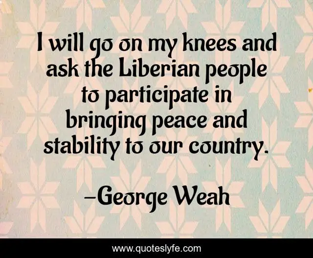This page presents the quote "I will go on my knees and ask the Liberian people to participate in bringing peace and stability to our country.". Author of this quote is George Weah. This quote is about country, people,.