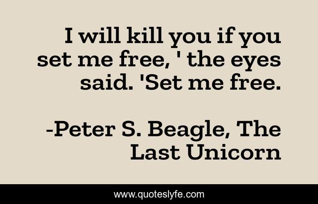 This page presents the quote "I will kill you if you set me free, ' the eyes said. 'Set me free.". Author of this quote is Peter S. Beagle, The Last Unicorn. This quote is about kill, darkness, free,.