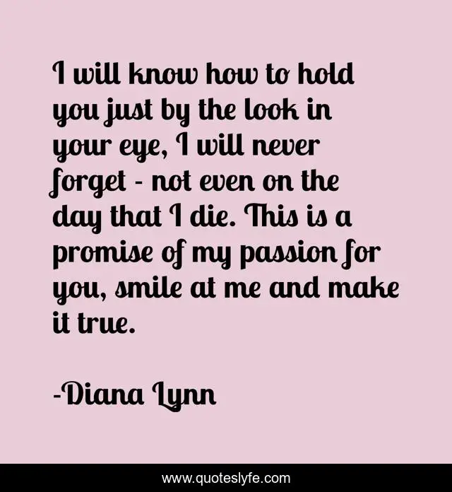 This page presents the quote "I will know how to hold you just by the look in your eye, I will never forget - not even on the day that I die. This is a promise of my passion for you, smile at me and make it true.". Author of this quote is Diana Lynn. This quote is about me, passion, day,.