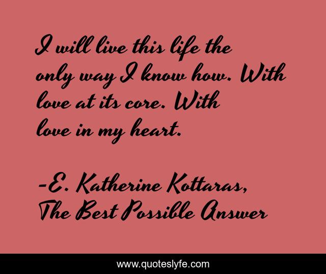 This page presents the quote "I will live this life the only way I know how. With love at its core. With love in my heart.". Author of this quote is E. Katherine Kottaras, The Best Possible Answer. This quote is about life, love, self-love, inspirational, enthusiasm, young-adult, affection,.