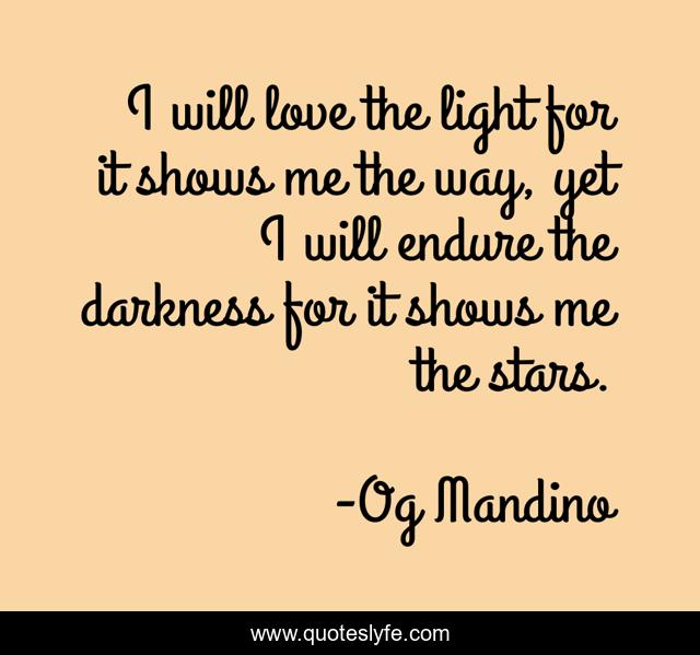 This page presents the quote "I will love the light for it shows me the way, yet I will endure the darkness for it shows me the stars.". Author of this quote is Og Mandino. This quote is about light, darkness, perspective,.