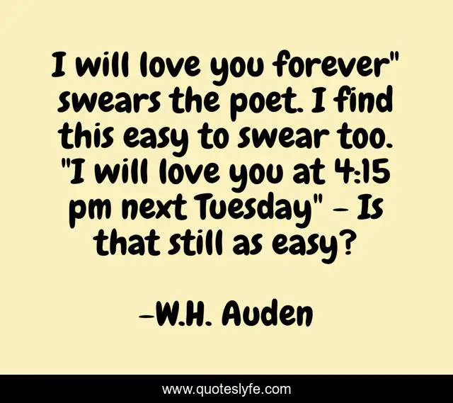 This page presents the quote "I will love you forever" swears the poet. I find this easy to swear too. "I will love you at 4:15 pm next Tuesday" - Is that still as easy?". Author of this quote is W.H. Auden. This quote is about love, poetry, affection,.