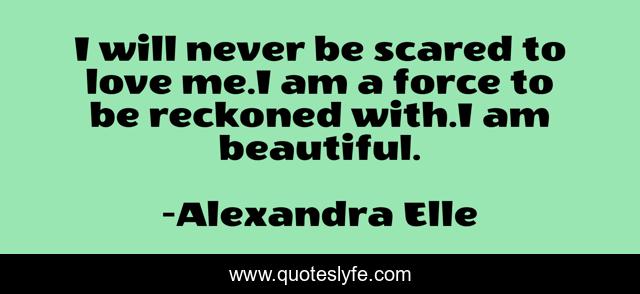 This page presents the quote "I will never be scared to love me.I am a force to be reckoned with.I am beautiful.". Author of this quote is Alexandra Elle. This quote is about beautiful, womanhood, alex-elle, self-love, know-your-worth,.