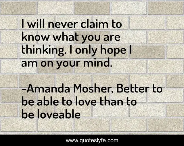 This page presents the quote "I will never claim to know what you are thinking. I only hope I am on your mind.". Author of this quote is Amanda Mosher, Better to be able to love than to be loveable. This quote is about relationships, longing, love, love-and-sayings, thinking, mind, word-junkies, think, affection,.