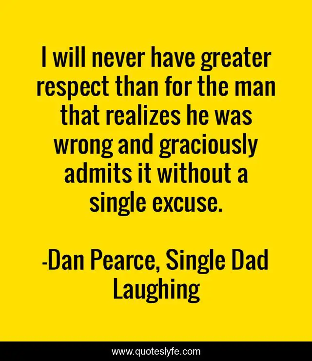 This page presents the quote "I will never have greater respect than for the man that realizes he was wrong and graciously admits it without a single excuse.". Author of this quote is Dan Pearce, Single Dad Laughing. This quote is about admitting-faults, pride, overcoming-pride, humility,.