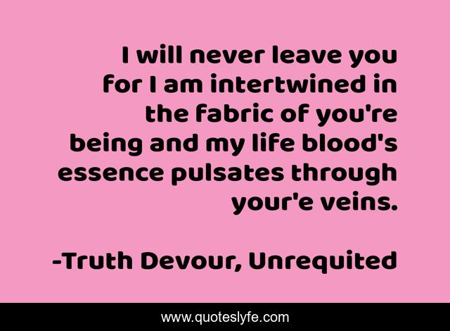 This page presents the quote "I will never leave you for I am intertwined in the fabric of you're being and my life blood's essence pulsates through your'e veins.". Author of this quote is Truth Devour, Unrequited. This quote is about lust, love, joy, romance, sated, wantin, truth-devour, affection,.