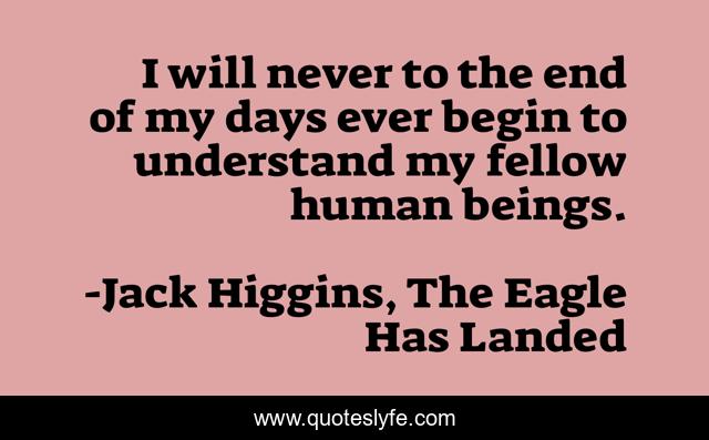 This page presents the quote "I will never to the end of my days ever begin to understand my fellow human beings.". Author of this quote is Jack Higgins, The Eagle Has Landed. This quote is about end, human-being, understand,.