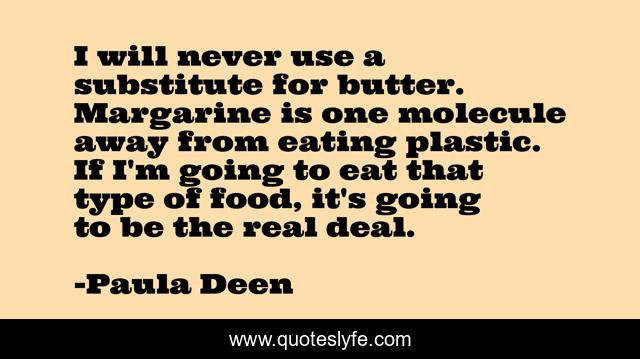 This page presents the quote "I will never use a substitute for butter. Margarine is one molecule away from eating plastic. If I'm going to eat that type of food, it's going to be the real deal.". Author of this quote is Paula Deen. This quote is about real, eating,.