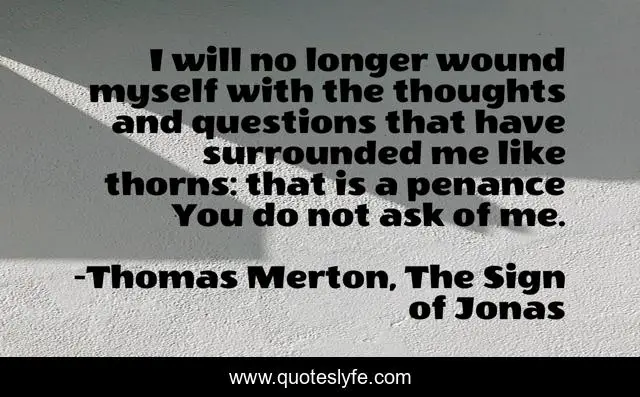 This page presents the quote "I will no longer wound myself with the thoughts and questions that have surrounded me like thorns: that is a penance You do not ask of me.". Author of this quote is Thomas Merton, The Sign of Jonas. .