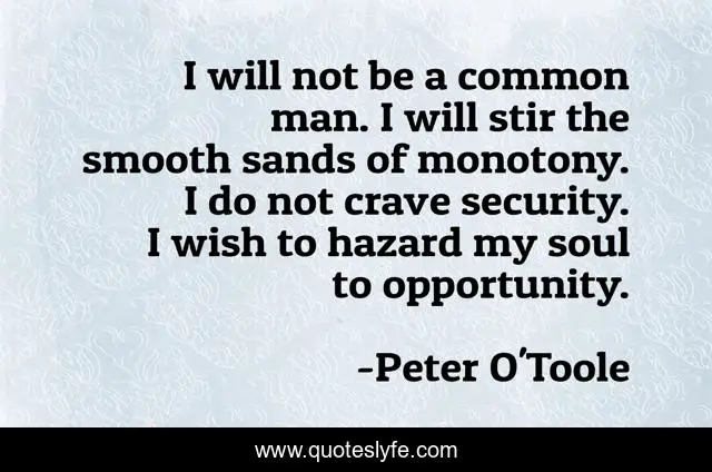 This page presents the quote "I will not be a common man. I will stir the smooth sands of monotony. I do not crave security. I wish to hazard my soul to opportunity.". Author of this quote is Peter O'Toole. This quote is about life, chances, adventures, soul, peter-o-toole, monotony, ordinary, opportunity, man,.