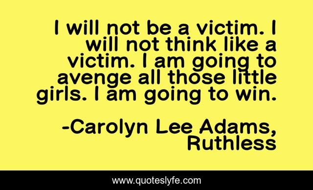 This page presents the quote "I will not be a victim. I will not think like a victim. I am going to avenge all those little girls. I am going to win.". Author of this quote is Carolyn Lee Adams, Ruthless. This quote is about victimhood, novel, girl-power, horror, fiction, ruthless, strength, suspense, ya,.